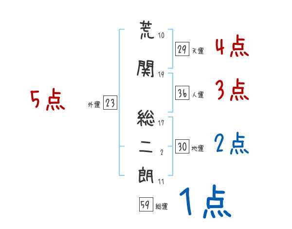 天運![]() | 荒関総二朗さんの天運は29画の4つ星!完全主義で才能がある。厳格な心の持ち主。 家系が持つ宿命的な運勢を表します。祖先から受け継いだ苗字ですので自分の力が及びません。家柄を象徴します。 |