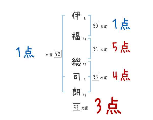 総運![]() | 伊福総司朗さんの総運は53画の3つ星!やや見栄っ張りで虚栄心がある。散財に注意。 あなたの人生を表す1番重要な運勢です。生涯を通じて影響する総合運となり、主に50歳以降の晩年期に影響を及ぼします。 |