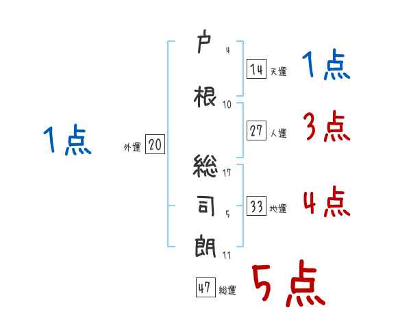 総運![]() | 戸根総司朗さんの総運は47画の5つ星!実力が開花し発展する円満な人生。財に恵まれる。 あなたの人生を表す1番重要な運勢です。生涯を通じて影響する総合運となり、主に50歳以降の晩年期に影響を及ぼします。 |