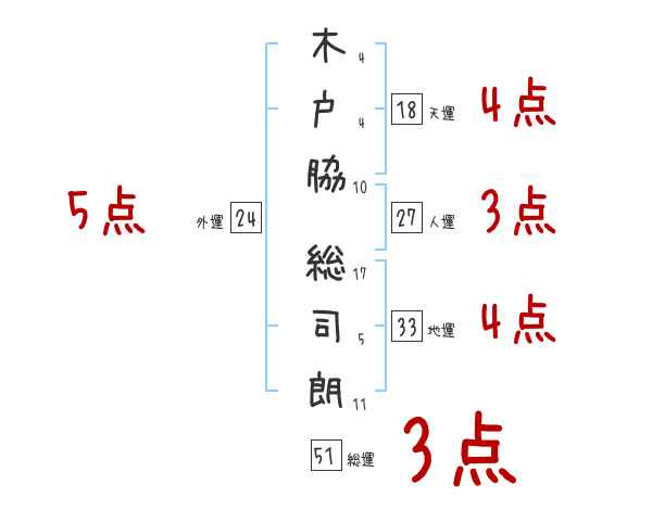 総運![]() | 木戸脇総司朗さんの総運は51画の3つ星!変化が激しく、危険に注意。堅実な性格。 あなたの人生を表す1番重要な運勢です。生涯を通じて影響する総合運となり、主に50歳以降の晩年期に影響を及ぼします。 |