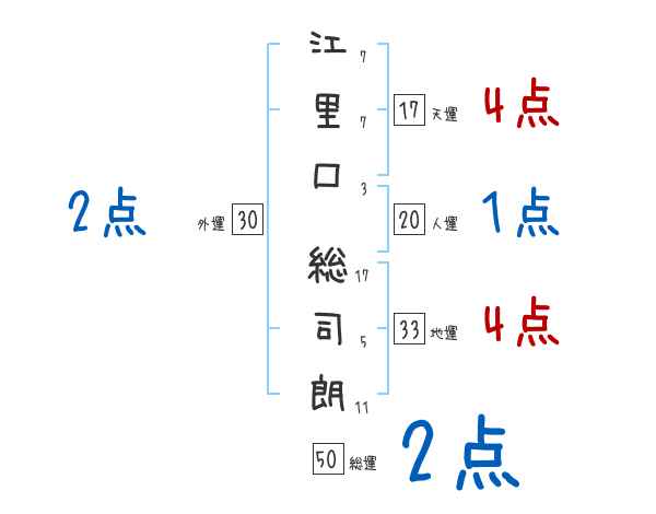 総運![]() | 江里口総司朗さんの総運は50画の2つ星!浮き沈みが激しく不安定。しりすぼみに衰退しやすいので注意しましょう。 あなたの人生を表す1番重要な運勢です。生涯を通じて影響する総合運となり、主に50歳以降の晩年期に影響を及ぼします。 |