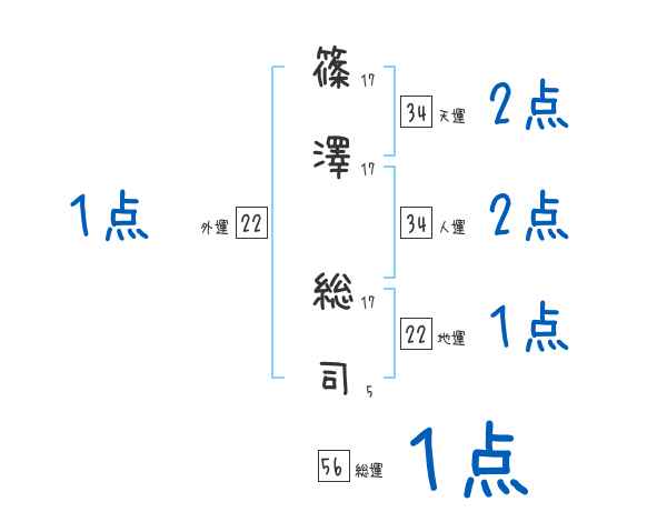 外運![]() | 篠澤総司さんの外運は22画の1つ星!努力することが苦手ないっぽう手先が器用。芸術性にも優れる。 生活面を象徴する運勢です。外部から受ける影響力を表し、結婚運、家庭運や職場、環境への順応性を表します。 |