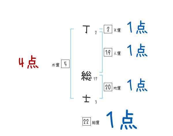 外運![]() | 丁総士さんの外運は5画の4つ星!健康で安泰。協調性に優れ、財産に恵まれる。 生活面を象徴する運勢です。外部から受ける影響力を表し、結婚運、家庭運や職場、環境への順応性を表します。 |