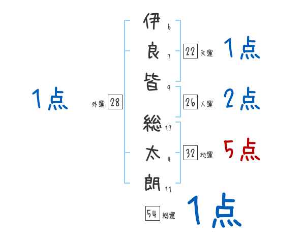 総運![]() | 伊良皆総太朗さんの総運は54画の1つ星!トラブルが多いかも。周りをよく見て協調して過ごしましょう。 あなたの人生を表す1番重要な運勢です。生涯を通じて影響する総合運となり、主に50歳以降の晩年期に影響を及ぼします。 |