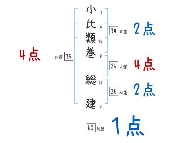 人運![]() | 小比類巻総建さんの人運は25画の4つ星!個性があり才能があふれる。強運の持ち主で発展する。 性格や才能などを表す2番目に重要な運勢です。人間関係や協調性、社会的な成功に影響します。主に20歳から50歳ぐらいまでの中年期の運勢を表します。 |