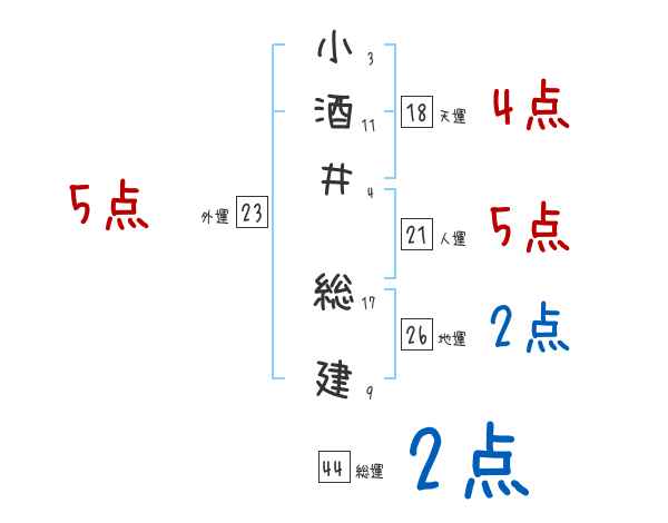 外運![]() | 小酒井総建さんの外運は23画の5つ星!想像力に優れ活力がある。一代で成功し名誉を手に入れる。 生活面を象徴する運勢です。外部から受ける影響力を表し、結婚運、家庭運や職場、環境への順応性を表します。 |
