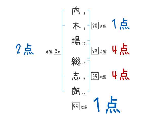 外運![]() | 内木場総志朗さんの外運は26画の2つ星!波瀾万丈かも。信頼できる人を大事にしましょう。 生活面を象徴する運勢です。外部から受ける影響力を表し、結婚運、家庭運や職場、環境への順応性を表します。 |
