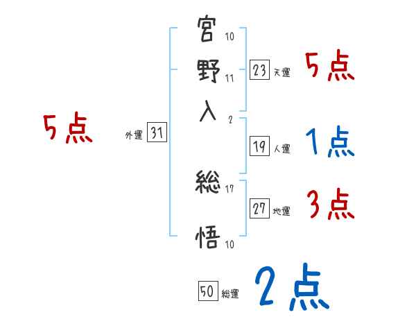 外運![]() | 宮野入総悟さんの外運は31画の5つ星!社交性があり判断力に優れる。順風満帆な人生で円満な生活。 生活面を象徴する運勢です。外部から受ける影響力を表し、結婚運、家庭運や職場、環境への順応性を表します。 |
