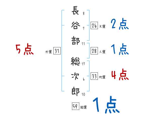 天運![]() | 長谷部総次郎さんの天運は26画の2つ星!波瀾万丈かも。信頼できる人を大事にしましょう。 家系が持つ宿命的な運勢を表します。祖先から受け継いだ苗字ですので自分の力が及びません。家柄を象徴します。 |