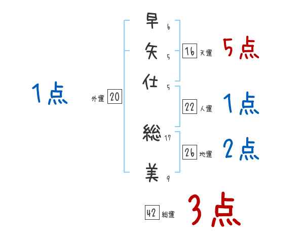 人運![]() | 早矢仕総美さんの人運は22画の1つ星!努力することが苦手ないっぽう手先が器用。芸術性にも優れる。 性格や才能などを表す2番目に重要な運勢です。人間関係や協調性、社会的な成功に影響します。主に20歳から50歳ぐらいまでの中年期の運勢を表します。 |