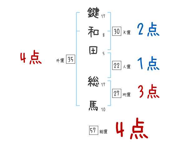 総運![]() | 鍵和田総馬さんの総運は57画の4つ星!向上心があり人望がある。地位を得る。 あなたの人生を表す1番重要な運勢です。生涯を通じて影響する総合運となり、主に50歳以降の晩年期に影響を及ぼします。 |