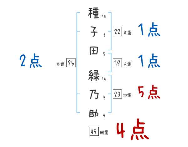 天運![]() | 種子田緑乃助さんの天運は22画の1つ星!努力することが苦手ないっぽう手先が器用。芸術性にも優れる。 家系が持つ宿命的な運勢を表します。祖先から受け継いだ苗字ですので自分の力が及びません。家柄を象徴します。 |