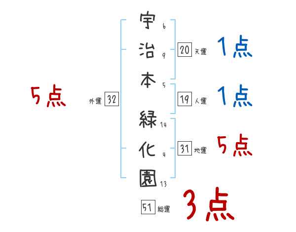 外運![]() | 宇治本緑化園さんの外運は32画の5つ星!柔軟性があり成功する。チャンスが多く金運が良い。 生活面を象徴する運勢です。外部から受ける影響力を表し、結婚運、家庭運や職場、環境への順応性を表します。 |