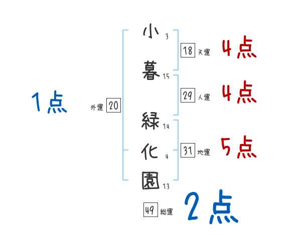 総運![]() | 小暮緑化園さんの総運は49画の2つ星!不安定な性格で明暗がある人生。周りの人には支援されやすい。 あなたの人生を表す1番重要な運勢です。生涯を通じて影響する総合運となり、主に50歳以降の晩年期に影響を及ぼします。 |