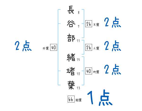 天運![]() | 長谷部緒堵葉さんの天運は26画の2つ星!波瀾万丈かも。信頼できる人を大事にしましょう。 家系が持つ宿命的な運勢を表します。祖先から受け継いだ苗字ですので自分の力が及びません。家柄を象徴します。 |