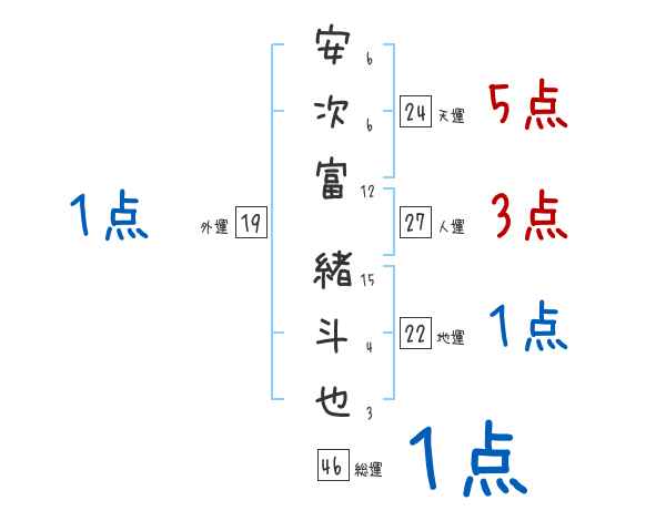 総運![]() | 安次富緒斗也さんの総運は46画の1つ星!迷走することが多く苦労するかも。目先のことにとらわれないように。 あなたの人生を表す1番重要な運勢です。生涯を通じて影響する総合運となり、主に50歳以降の晩年期に影響を及ぼします。 |