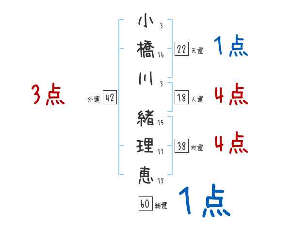 外運![]() | 小橋川緒理恵さんの外運は42画の3つ星!病気に注意。多芸であるが消極的でおとなしい。 生活面を象徴する運勢です。外部から受ける影響力を表し、結婚運、家庭運や職場、環境への順応性を表します。 |