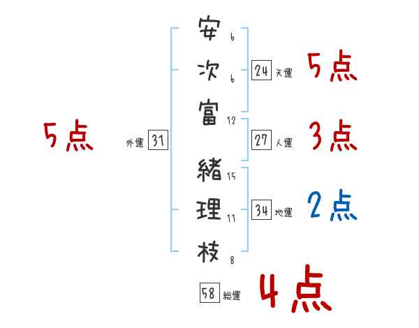 天運![]() | 安次富緒理枝さんの天運は24画の5つ星!家庭運が良く順調な人生。金運にも恵まれる。 家系が持つ宿命的な運勢を表します。祖先から受け継いだ苗字ですので自分の力が及びません。家柄を象徴します。 |