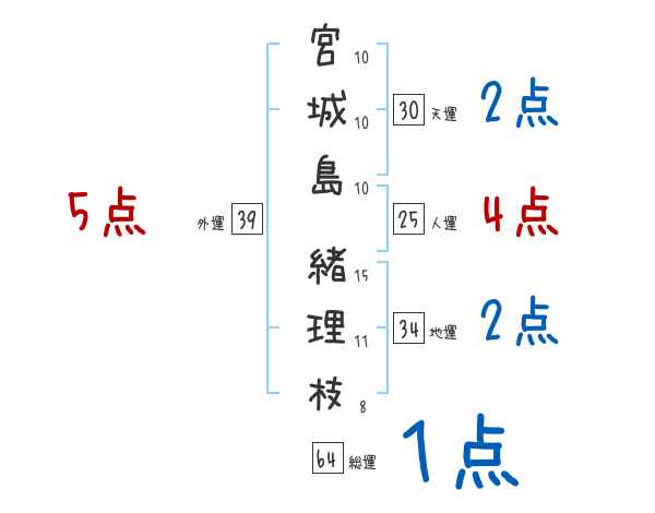 外運![]() | 宮城島緒理枝さんの外運は39画の5つ星!社交性に優れ人望が厚い。人の上に立ち成功する。 生活面を象徴する運勢です。外部から受ける影響力を表し、結婚運、家庭運や職場、環境への順応性を表します。 |