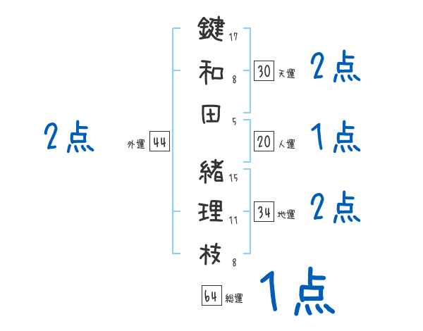 天運![]() | 鍵和田緒理枝さんの天運は30画の2つ星!浮き沈みの激しさに注意しましょう。 家系が持つ宿命的な運勢を表します。祖先から受け継いだ苗字ですので自分の力が及びません。家柄を象徴します。 |