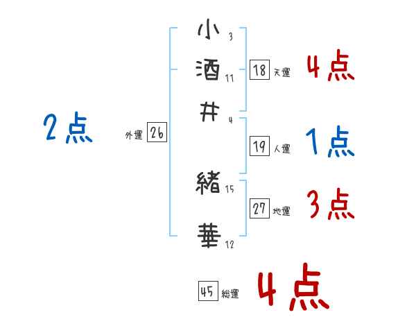 天運![]() | 小酒井緒華さんの天運は18画の4つ星!情熱的で剛気。忍耐力があり信頼される。 家系が持つ宿命的な運勢を表します。祖先から受け継いだ苗字ですので自分の力が及びません。家柄を象徴します。 |