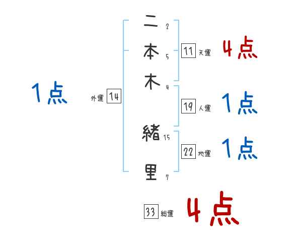 総運![]() | 二本木緒里さんの総運は33画の4つ星!権力志向でプライドが高い。勇気があり運を切り開き成功する。 あなたの人生を表す1番重要な運勢です。生涯を通じて影響する総合運となり、主に50歳以降の晩年期に影響を及ぼします。 |