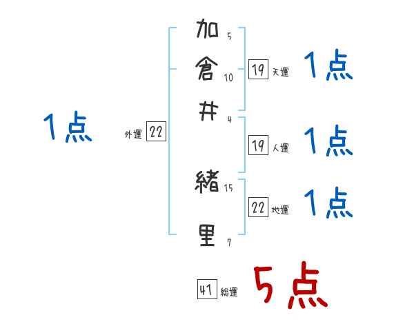 天運![]() | 加倉井緒里さんの天運は19画の1つ星!優れた才能を持ちますが、協調性が足りないことも。周りの人と協力する事を意識しましょう。 家系が持つ宿命的な運勢を表します。祖先から受け継いだ苗字ですので自分の力が及びません。家柄を象徴します。 |