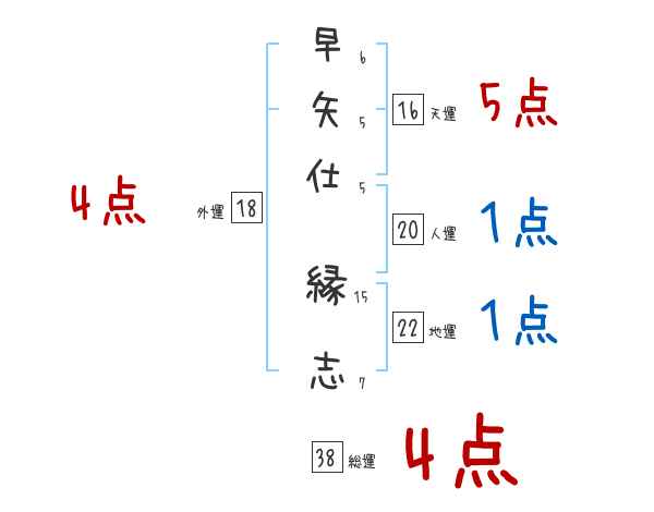 天運![]() | 早矢仕縁志さんの天運は16画の5つ星!人望が厚く大きく発展する。逆転成功が見える。 家系が持つ宿命的な運勢を表します。祖先から受け継いだ苗字ですので自分の力が及びません。家柄を象徴します。 |