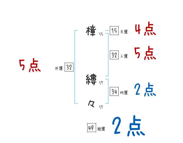 人運![]() | 樟縷々さんの人運は32画の5つ星!柔軟性があり成功する。チャンスが多く金運が良い。 性格や才能などを表す2番目に重要な運勢です。人間関係や協調性、社会的な成功に影響します。主に20歳から50歳ぐらいまでの中年期の運勢を表します。 |
