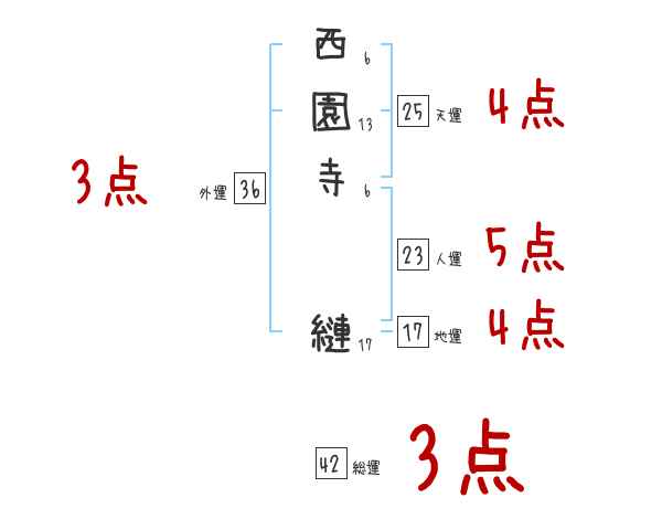 総運![]() | 西園寺縺さんの総運は42画の3つ星!病気に注意。多芸であるが消極的でおとなしい。 あなたの人生を表す1番重要な運勢です。生涯を通じて影響する総合運となり、主に50歳以降の晩年期に影響を及ぼします。 |