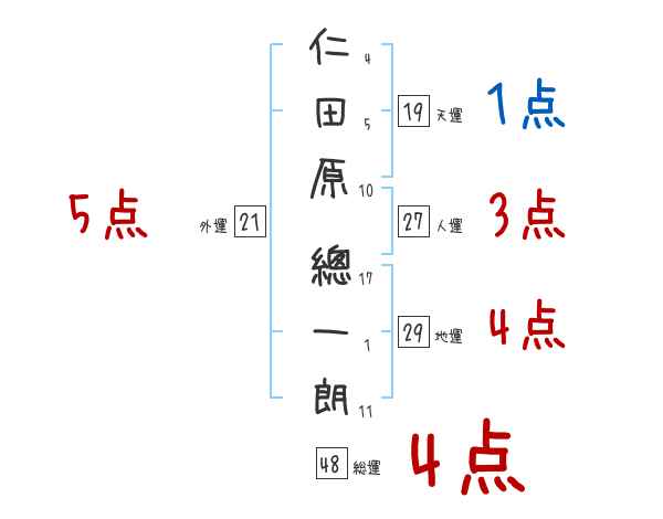 天運![]() | 仁田原總一朗さんの天運は19画の1つ星!優れた才能を持ちますが、協調性が足りないことも。周りの人と協力する事を意識しましょう。 家系が持つ宿命的な運勢を表します。祖先から受け継いだ苗字ですので自分の力が及びません。家柄を象徴します。 |