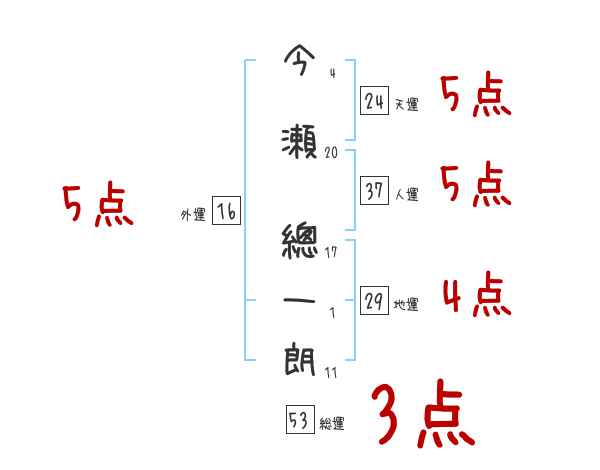 外運![]() | 今瀬總一朗さんの外運は16画の5つ星!人望が厚く大きく発展する。逆転成功が見える。 生活面を象徴する運勢です。外部から受ける影響力を表し、結婚運、家庭運や職場、環境への順応性を表します。 |