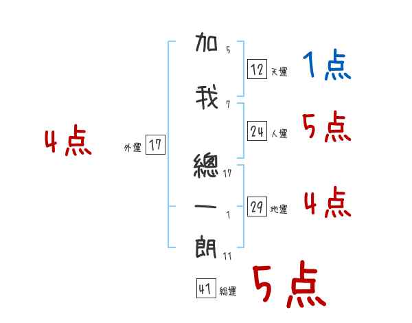 外運![]() | 加我總一朗さんの外運は17画の4つ星!積極的な行動力。地位を気づき財産を手に入れる。純粋な心と直感力。 生活面を象徴する運勢です。外部から受ける影響力を表し、結婚運、家庭運や職場、環境への順応性を表します。 |