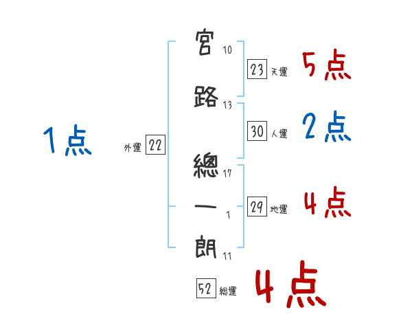天運![]() | 宮路總一朗さんの天運は23画の5つ星!想像力に優れ活力がある。一代で成功し名誉を手に入れる。 家系が持つ宿命的な運勢を表します。祖先から受け継いだ苗字ですので自分の力が及びません。家柄を象徴します。 |