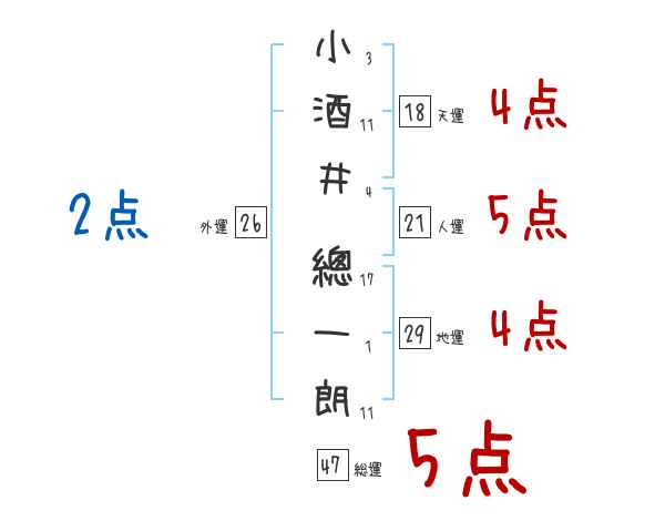 総運![]() | 小酒井總一朗さんの総運は47画の5つ星!実力が開花し発展する円満な人生。財に恵まれる。 あなたの人生を表す1番重要な運勢です。生涯を通じて影響する総合運となり、主に50歳以降の晩年期に影響を及ぼします。 |