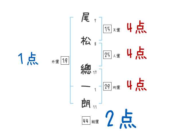 総運![]() | 尾松總一朗さんの総運は44画の2つ星!誠実で慎重な性格。物事を考えすぎないように注意しましょう。 あなたの人生を表す1番重要な運勢です。生涯を通じて影響する総合運となり、主に50歳以降の晩年期に影響を及ぼします。 |