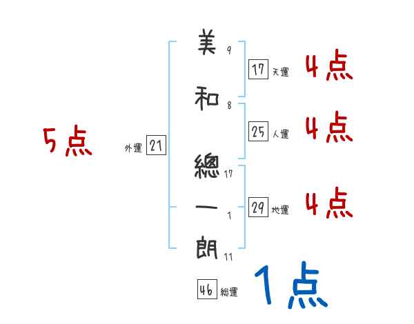 外運![]() | 美和總一朗さんの外運は21画の5つ星!統率力がある。独立し成功する。名誉を手に入れる。 生活面を象徴する運勢です。外部から受ける影響力を表し、結婚運、家庭運や職場、環境への順応性を表します。 |
