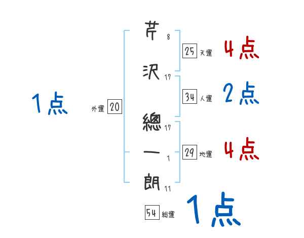 総運![]() | 芹沢總一朗さんの総運は54画の1つ星!トラブルが多いかも。周りをよく見て協調して過ごしましょう。 あなたの人生を表す1番重要な運勢です。生涯を通じて影響する総合運となり、主に50歳以降の晩年期に影響を及ぼします。 |