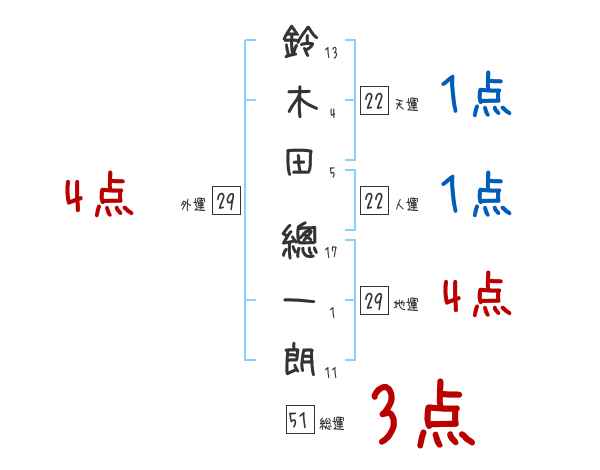 外運![]() | 鈴木田總一朗さんの外運は29画の4つ星!完全主義で才能がある。厳格な心の持ち主。 生活面を象徴する運勢です。外部から受ける影響力を表し、結婚運、家庭運や職場、環境への順応性を表します。 |
