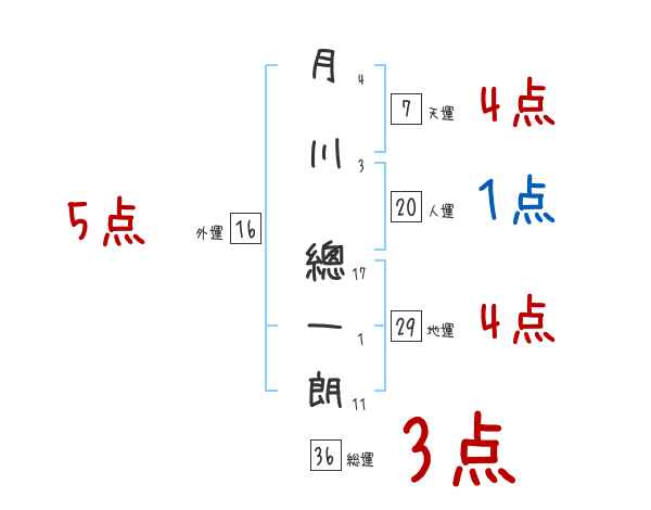 総運![]() | 月川總一朗さんの総運は36画の3つ星!先見性が豊かです。多少神経質で苦労することも。 あなたの人生を表す1番重要な運勢です。生涯を通じて影響する総合運となり、主に50歳以降の晩年期に影響を及ぼします。 |