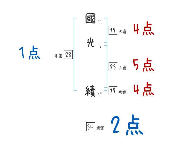 総運![]() | 國光績さんの総運は34画の2つ星!独創性に優れるが、自尊心が強く災難に注意しましょう。 あなたの人生を表す1番重要な運勢です。生涯を通じて影響する総合運となり、主に50歳以降の晩年期に影響を及ぼします。 |