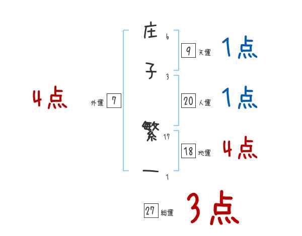 外運![]() | 庄子繁一さんの外運は7画の4つ星!強い意志や信念を持ち独立心が強い。自立する。 生活面を象徴する運勢です。外部から受ける影響力を表し、結婚運、家庭運や職場、環境への順応性を表します。 |