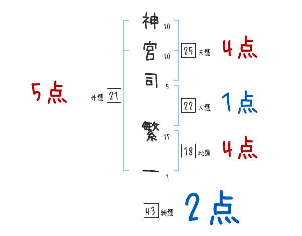 天運![]() | 神宮司繁一さんの天運は25画の4つ星!個性があり才能があふれる。強運の持ち主で発展する。 家系が持つ宿命的な運勢を表します。祖先から受け継いだ苗字ですので自分の力が及びません。家柄を象徴します。 |