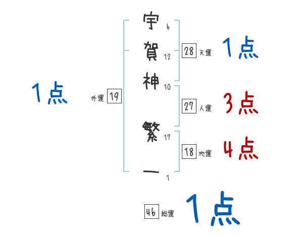 天運![]() | 宇賀神繁一さんの天運は28画の1つ星!家庭環境に注意。スポーツで活躍できる能力があるかも。 家系が持つ宿命的な運勢を表します。祖先から受け継いだ苗字ですので自分の力が及びません。家柄を象徴します。 |