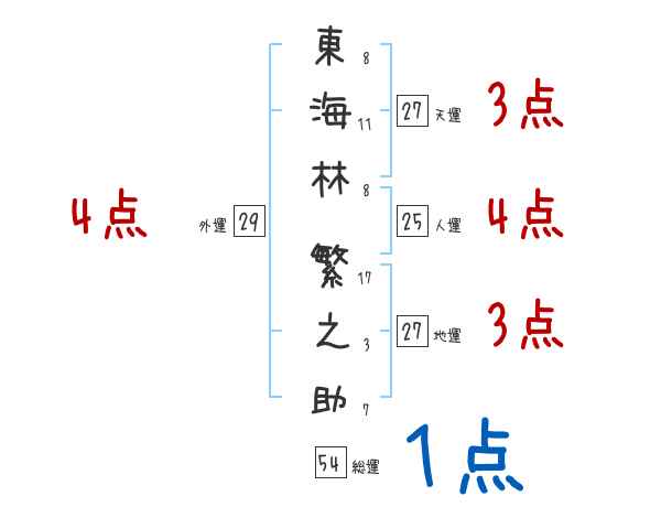 天運![]() | 東海林繁之助さんの天運は27画の3つ星!頭脳明晰だが強情で摩擦が多い傾向。孤立に注意。 家系が持つ宿命的な運勢を表します。祖先から受け継いだ苗字ですので自分の力が及びません。家柄を象徴します。 |