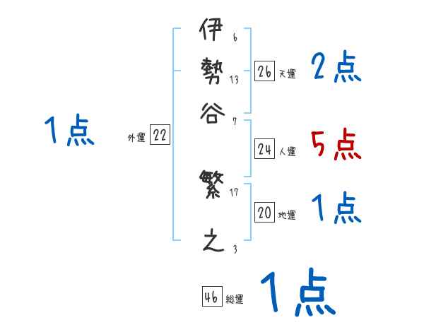 天運![]() | 伊勢谷繁之さんの天運は26画の2つ星!波瀾万丈かも。信頼できる人を大事にしましょう。 家系が持つ宿命的な運勢を表します。祖先から受け継いだ苗字ですので自分の力が及びません。家柄を象徴します。 |