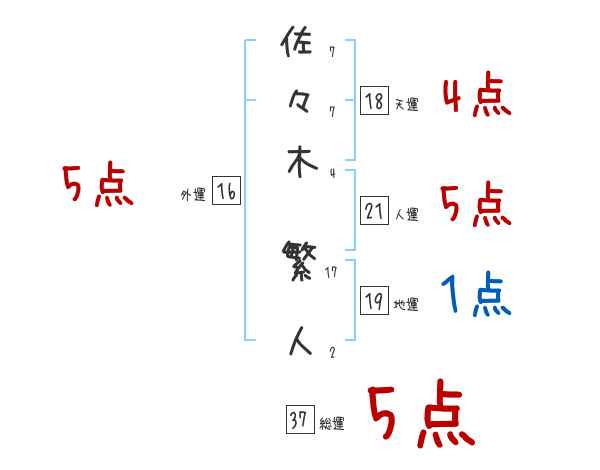 人運![]() | 佐々木繁人さんの人運は21画の5つ星!統率力がある。独立し成功する。名誉を手に入れる。 性格や才能などを表す2番目に重要な運勢です。人間関係や協調性、社会的な成功に影響します。主に20歳から50歳ぐらいまでの中年期の運勢を表します。 |