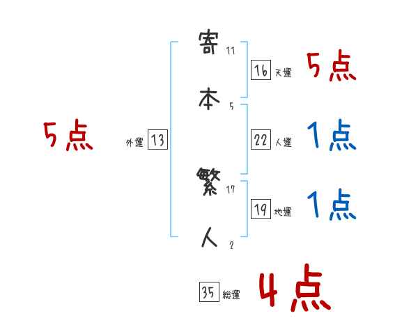 天運![]() | 寄本繁人さんの天運は16画の5つ星!人望が厚く大きく発展する。逆転成功が見える。 家系が持つ宿命的な運勢を表します。祖先から受け継いだ苗字ですので自分の力が及びません。家柄を象徴します。 |