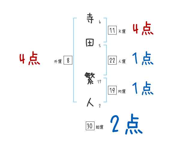 天運![]() | 寺田繁人さんの天運は11画の4つ星!着実に富や地位を得る幸運な人生。 家系が持つ宿命的な運勢を表します。祖先から受け継いだ苗字ですので自分の力が及びません。家柄を象徴します。 |