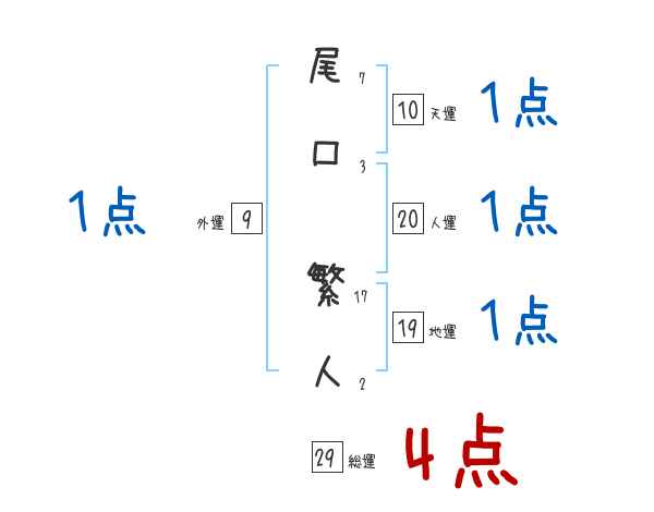 天運![]() | 尾口繁人さんの天運は10画の1つ星!不安を感じやすい傾向。ストレスを抱えないように注意しましょう。 家系が持つ宿命的な運勢を表します。祖先から受け継いだ苗字ですので自分の力が及びません。家柄を象徴します。 |